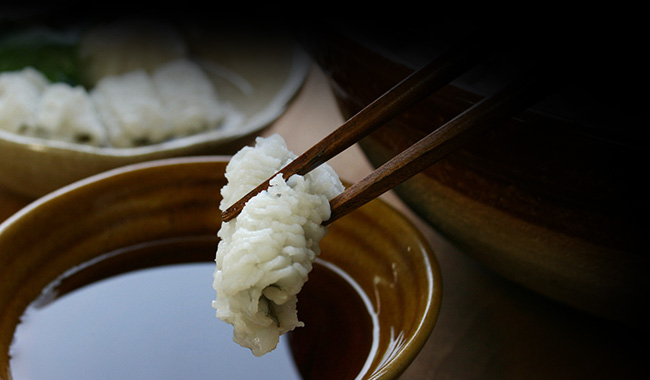 関西で生まれたはも鍋。初夏の鱧は梅雨の真水によっておいしくなると言われる上品で繊細な味わい、夏に産卵を終えた頃には食欲旺盛となり、脂がのった濃厚な味わいと季節によってそれぞれの楽しみがあります。鱧との相性がとってもよい玉ねぎと一緒にどうぞ。そのままお出汁で頂くも良し、またポン酢ともとてもよく合います。